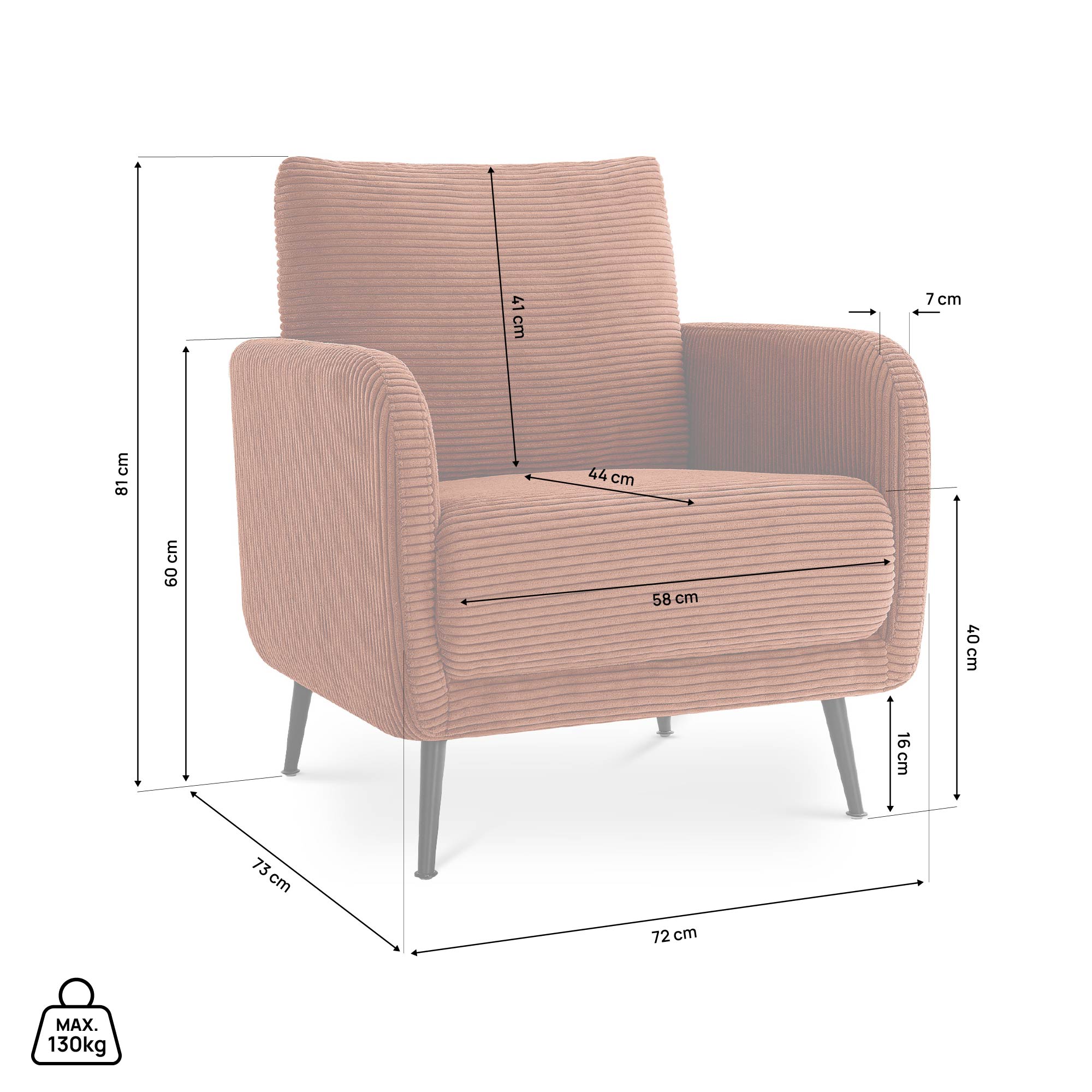 Le fauteuil EMMA apportera une touche moderne et branchée à votre intérieur avec son revêtement en velours côtelé, désormais devenu un incontournable de l'aménagement intérieur. Alliant élégance et confort, ce tissu à la pointe de la tendance offre une expérience sensorielle unique. Le velours côtelé n'est cependant pas recommandé pour les foyers avec des animaux de compagnie en raison de sa sensibilité aux griffures. Grâce au revêtement en velours côtelé, notre fauteuil EMMA offrira une touche d'élégance et de modernité à votre décoration intérieure.